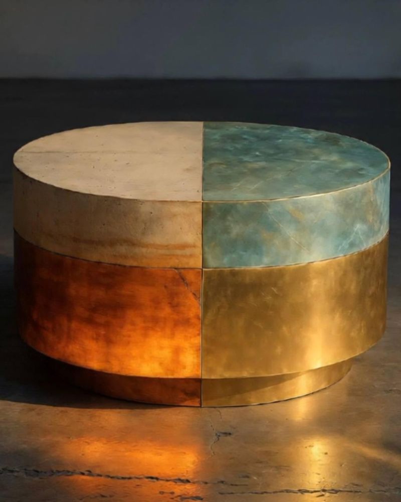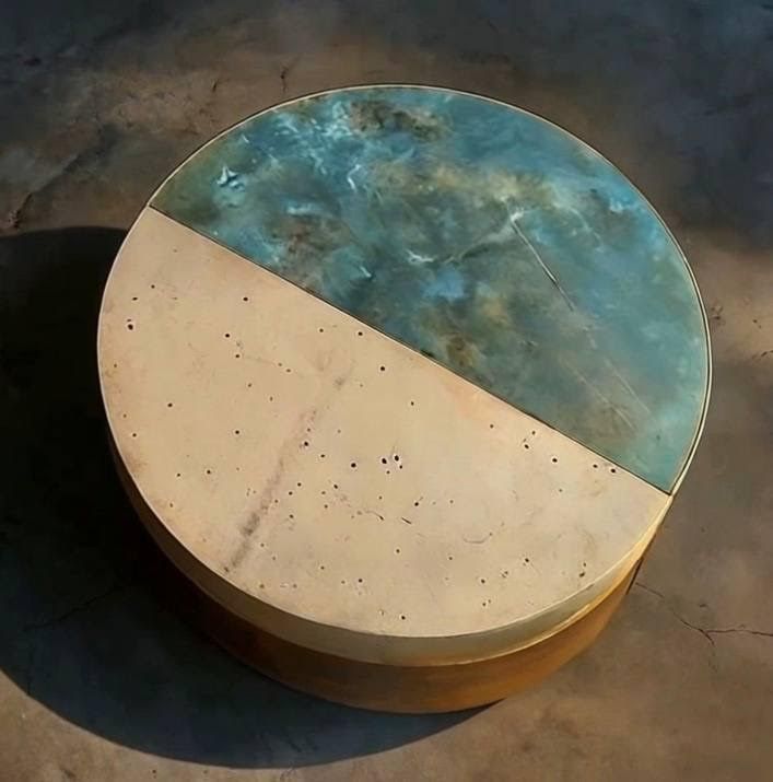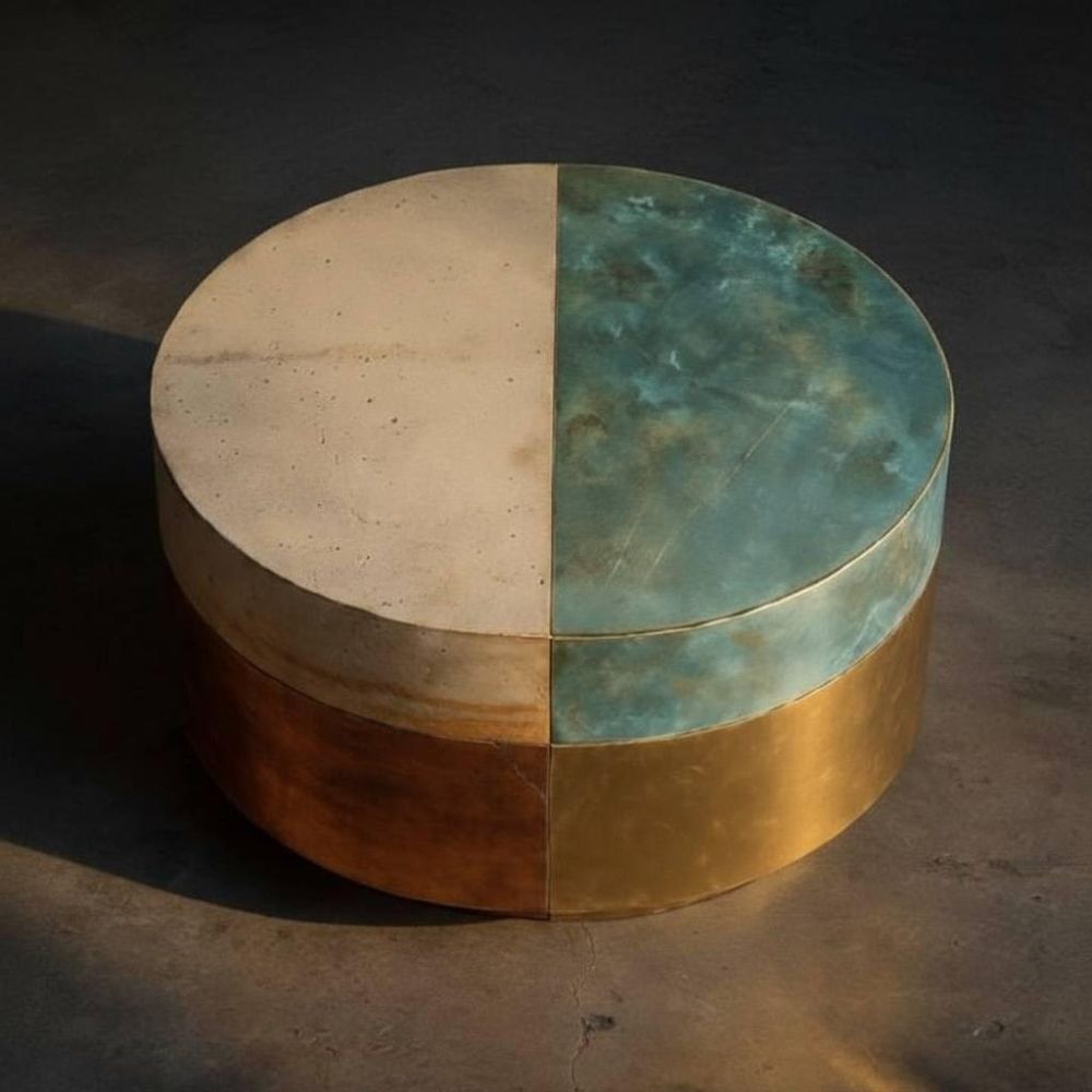 This round coffee table is the result of a talented designer who combines modern technology with an artistic approach. Made of MDF and composite materials, with a unique finish combining microcement and liquid metal, the table is a striking example of how materials can transform a piece of furniture into a true art object.